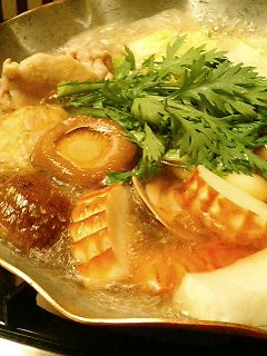 はまぐりの口が開いたら、かしわ(tri)・海老・湯葉などとお野菜をイン!